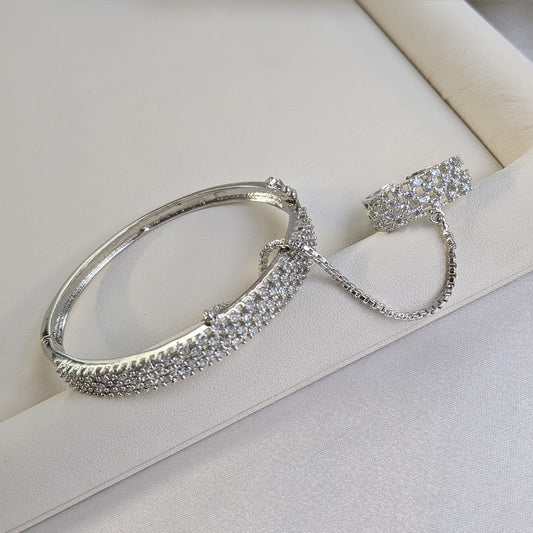 Add a touch of refined sparkle to your look with this Elegant Silver Finish Four-Line AD Finger Ring Bracelet. Crafted with precision and adorned with high-quality American Diamonds, this bracelet-ring combo blends modern charm with timeless grace. Perfect for festive occasions, parties, or elegant evenings out.