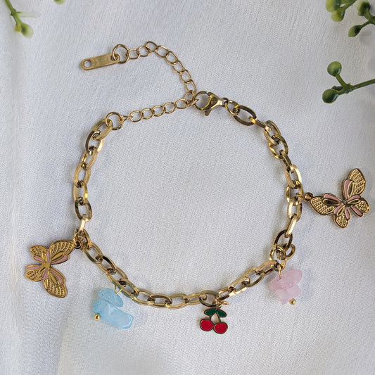 Embrace delicate beauty with 18 K Gold Plated Apple Blossom Butterfly Charm Chain Bracelet (Anti-Tarnish). Featuring exquisite butterfly charms crafted with intricate detail, this bracelet captures the graceful flutter of wings amidst the soft bloom of apple blossoms. Set on a gleaming gold-plated chain, it brings a touch of nature’s...