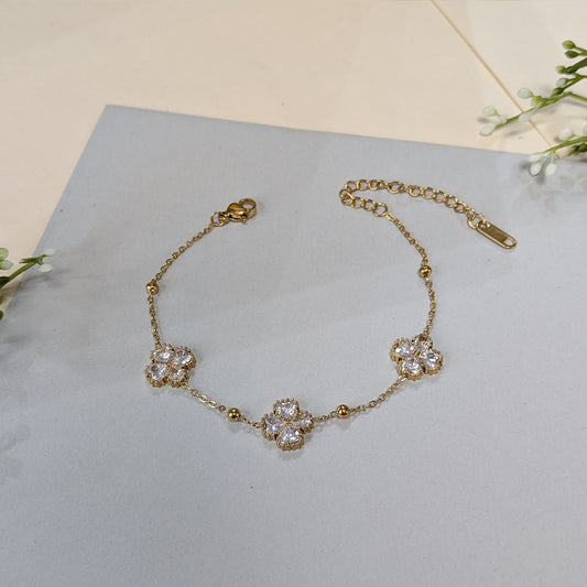 Embrace refined elegance with the Gold Finish Triple Crystal Floral Bracelet for Women (Anti-Tarnish). Designed with three radiant floral motifs, each accented with sparkling crystals, this bracelet beautifully captures the essence of femininity and grace. The luxurious gold finish enhances its delicate petals, while the anti-tarnish coating ensures long-lasting shine...