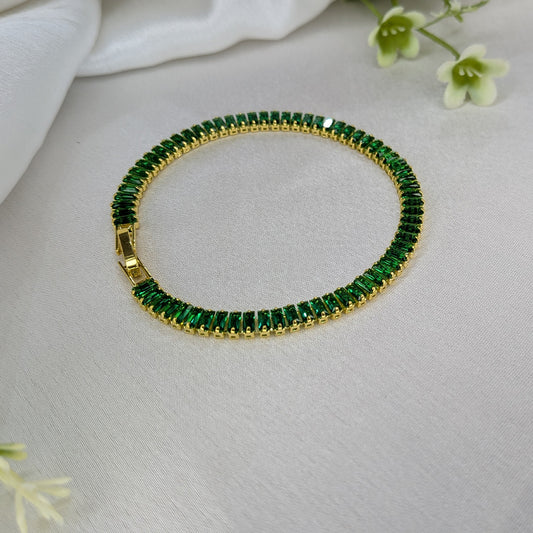 Add a touch of regal charm to your look with this stunning gold-plated tennis bracelet adorned with vibrant emerald green AD stones. Each baguette-cut stone is set in a sleek, uniform pattern, creating a graceful row of rich colour and sparkle. Lightweight, flexible, and elegant, this bracelet is perfect for...