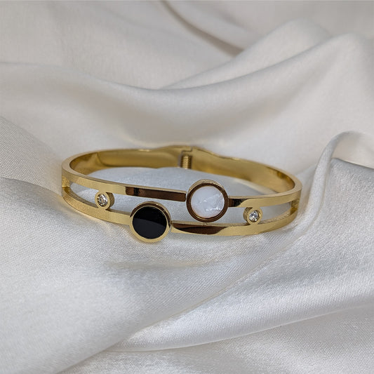 Add a touch of modern elegance to your look with this stunning Gold Plated Enamel Accent Bracelet, designed for women and girls who love stylish and versatile jewelry. Featuring a chic dual-tone design with black and white enamel circles, Whether you’re dressing up for parties, office wear, festive celebrations, birthdays,...