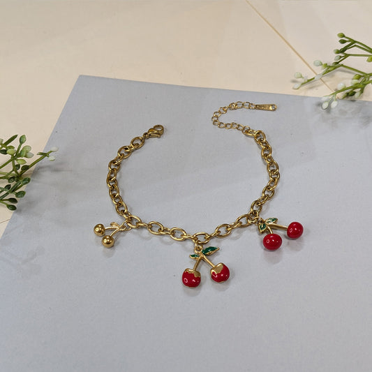 Add a pop of rich color to your look with the 18 K Gold Plated Crimson Berry Tropical Charm Chain Bracelet (Anti-Tarnish). Featuring vivid crimson berry charms beautifully set on a gleaming gold-plated chain, this bracelet brings a fresh and playful tropical vibe to any outfit.Perfect for festive occasions, special...