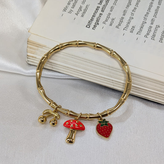 Add a touch of playful elegance to your jewelry collection with this adorable gold finish charm bracelet. Designed with a stylish bamboo-textured band, this bracelet features three vibrant enamel charms—a sweet strawberry, a sparkling cherry duo, and a cute red mushroom. Each charm adds its own pop of color and...