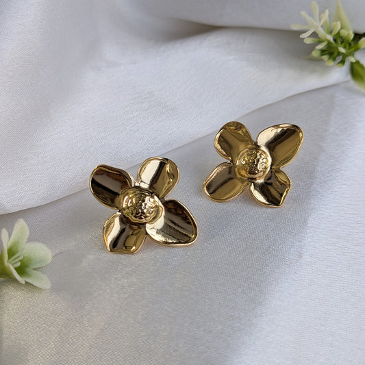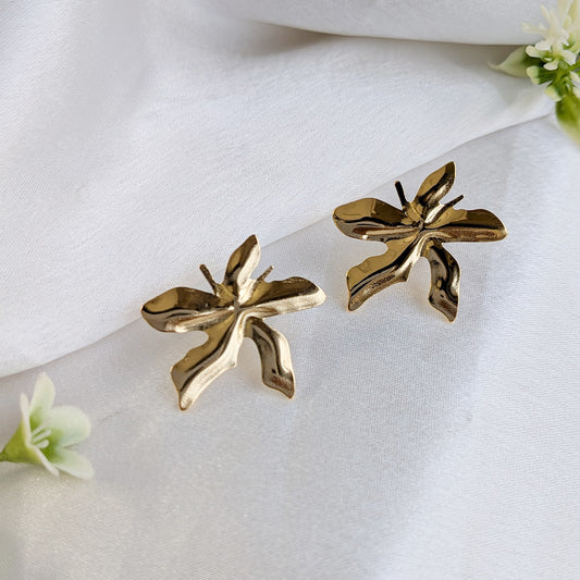 Bring bold elegance to your style with these Gold Textured Flower Stud Earrings, designed to make an effortless statement. Each earring features a beautifully sculpted five-petal flower with a hammered, reflective finish that adds depth, shine, and artistic character. The organic, uneven texture gives the earrings a handcrafted look, making...