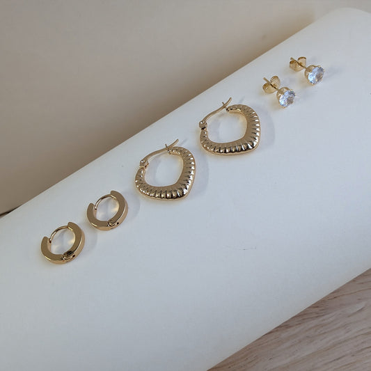 A timeless trio crafted to elevate every look. This set features textured teardrop hoops, sleek mini hoops, and classic solitaire studs — perfect for effortless transitions from day to night. Elegant, versatile, and refined.