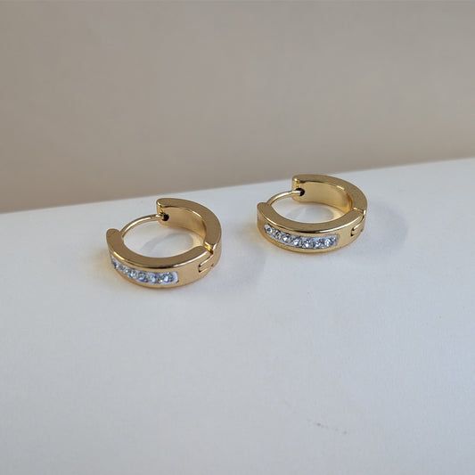 A curated trio of timeless silhouettes — textured statement hoops, polished mini huggies, and luminous crystal studs. Designed to add a refined golden touch to every occasion, from everyday elegance to evening allure.