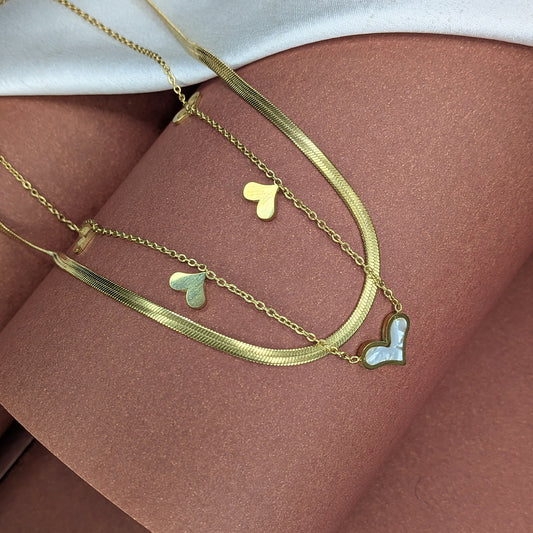 Enhance your everyday style with this elegant Gold Finish Double Layer Heart Pendant Necklace, designed to add a touch of charm and sophistication to any outfit. This beautiful necklace features a stylish dual-layer chain one sleek snake chain and one delicate link chain—each adorned with cute heart-shaped charms that create...
