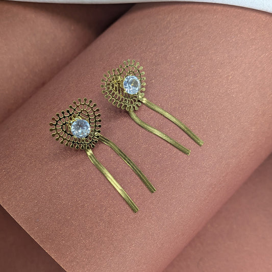 Add timeless elegance to your style with this Gold Plated Heart & Earring Set, featuring a stunning open-heart design adorned with a brilliant cubic zirconia crystal at the center. The delicate hanging tassels enhance its graceful charm, making it perfect for festive occasions, parties, or romantic evenings. Crafted with precision,...