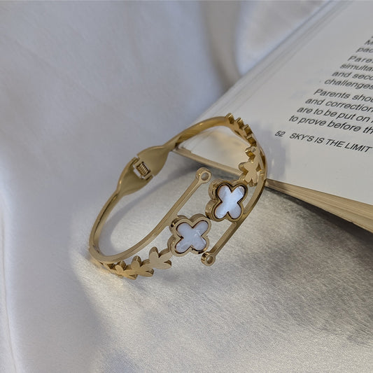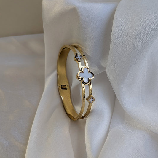 Bring a touch of charm and elegance to your jewelry collection with this stunning gold plated clover bracelet. Featuring three delicate four leaf clover motifs filled with glossy white enamel, this piece symbolizes luck, love, and happiness, Expertly crafted from high-quality stainless steel, the bracelet offers a durable, tarnish-resistant finish...