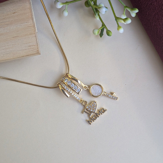 Celebrate love and gratitude with this Gold Plated “I Love Mama” & Key Charm Pendant, a perfect symbol of affection and appreciation. Crafted with elegance, this necklace features a sparkling “I Love Mama” charm adorned with fine crystals, paired with a key-shaped pendant that represents love, trust, and family bonds.