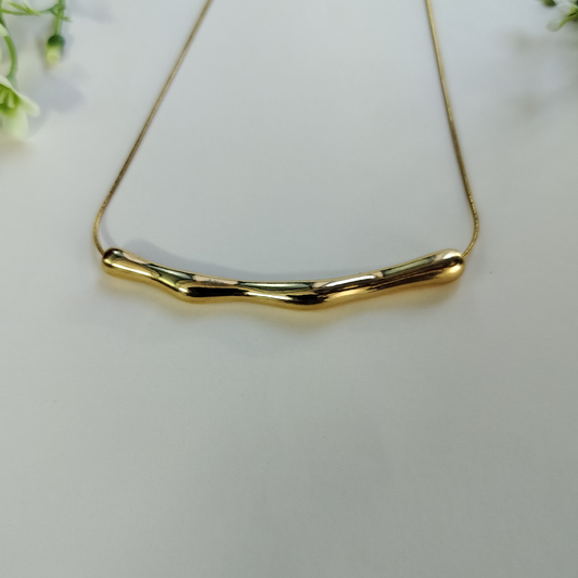 An artisanal gold chain with a gently flowing, organic-shaped pendant that symbolizes calm and grace. A versatile accessory for daily wear, office wear, night out.