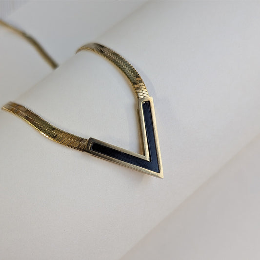 Crafted with a premium gold-plated finish, this elegant necklace features a bold V-cut pendant framed with enamel for a striking look. The smooth herringbone chain adds a luxurious touch, making it perfect for office wear, festive outings, and special occasions.