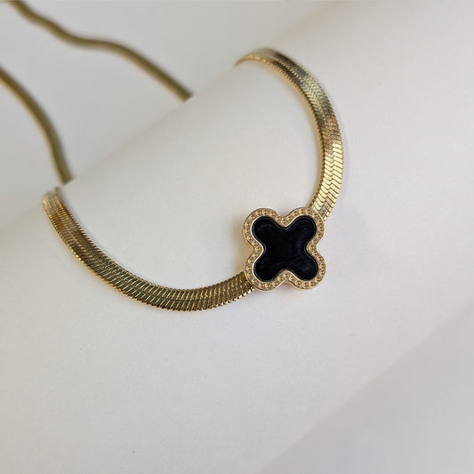 A stunning gold-plated necklace featuring a sleek snake chain and a black enamel four-leaf clover charm. Designed for everyday elegance, this piece adds a touch of luxury to any outfit.