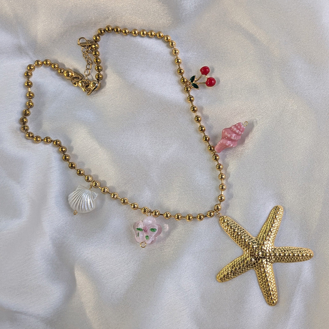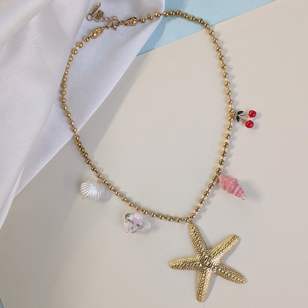 Celebrate the beauty of the sea with this elegant gold beaded necklace accented by delightful ocean-inspired charms, including a textured starfish, a seashell, and cheerful cherries. Lightweight and versatile, this necklace is perfect for adding a splash of coastal charm to any outfit, whether at the beach or city streets.