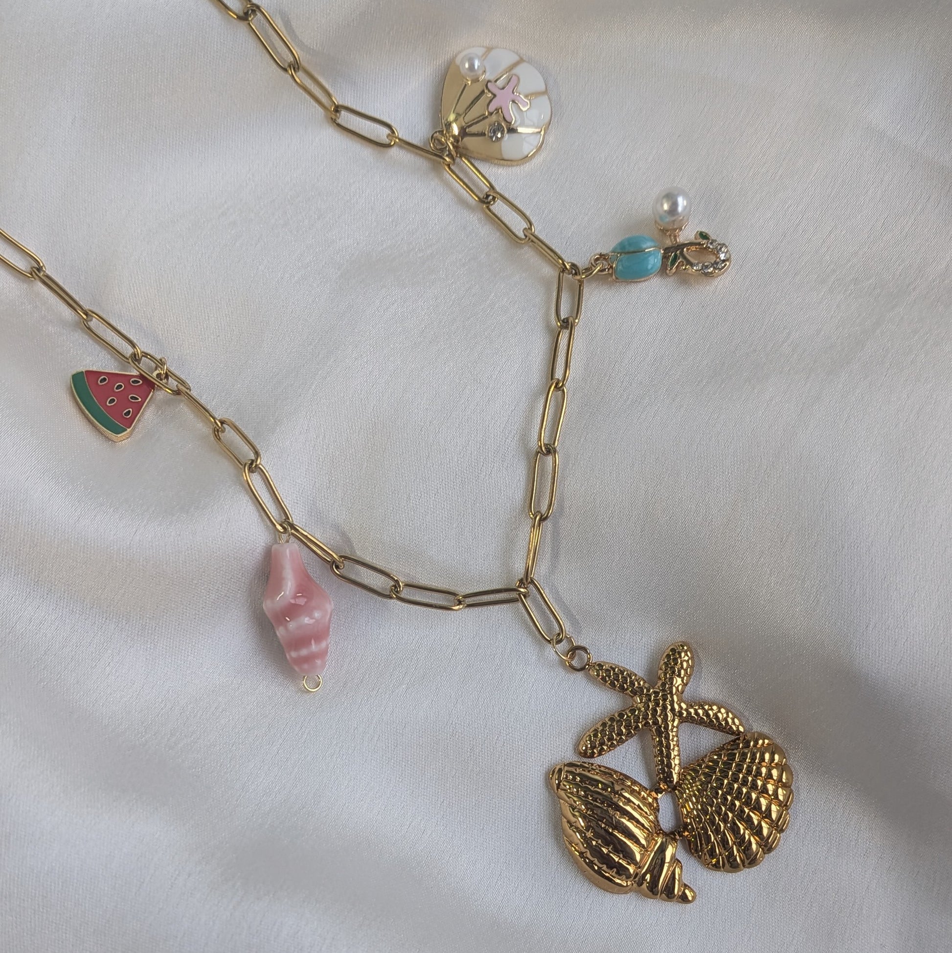 Embrace the beach vibe with this elegant gold-tone necklace adorned with playful charms like a starfish, seashell, and colorful fruit and shell accents. A must-have accessory for your beach days or summer outings.