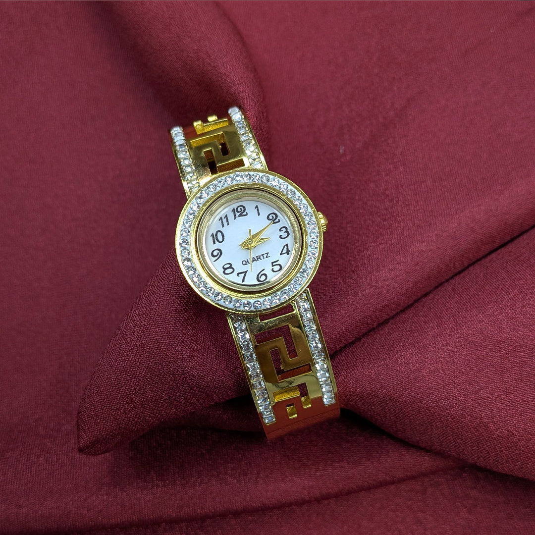 One line of the bangle is elegantly adorned with shimmering American Diamonds (AD), providing a subtle yet brilliant sparkle. This dual-line aesthetic highlights geometric precision, a popular trend in contemporary accessory design. The watch maintains a classic analog display, powered by a reliable quartz movement. Finished in a high-shine polish, this watch offers a sophisticated, lightweight feel and serves as a versatile statement piece for any occasion.