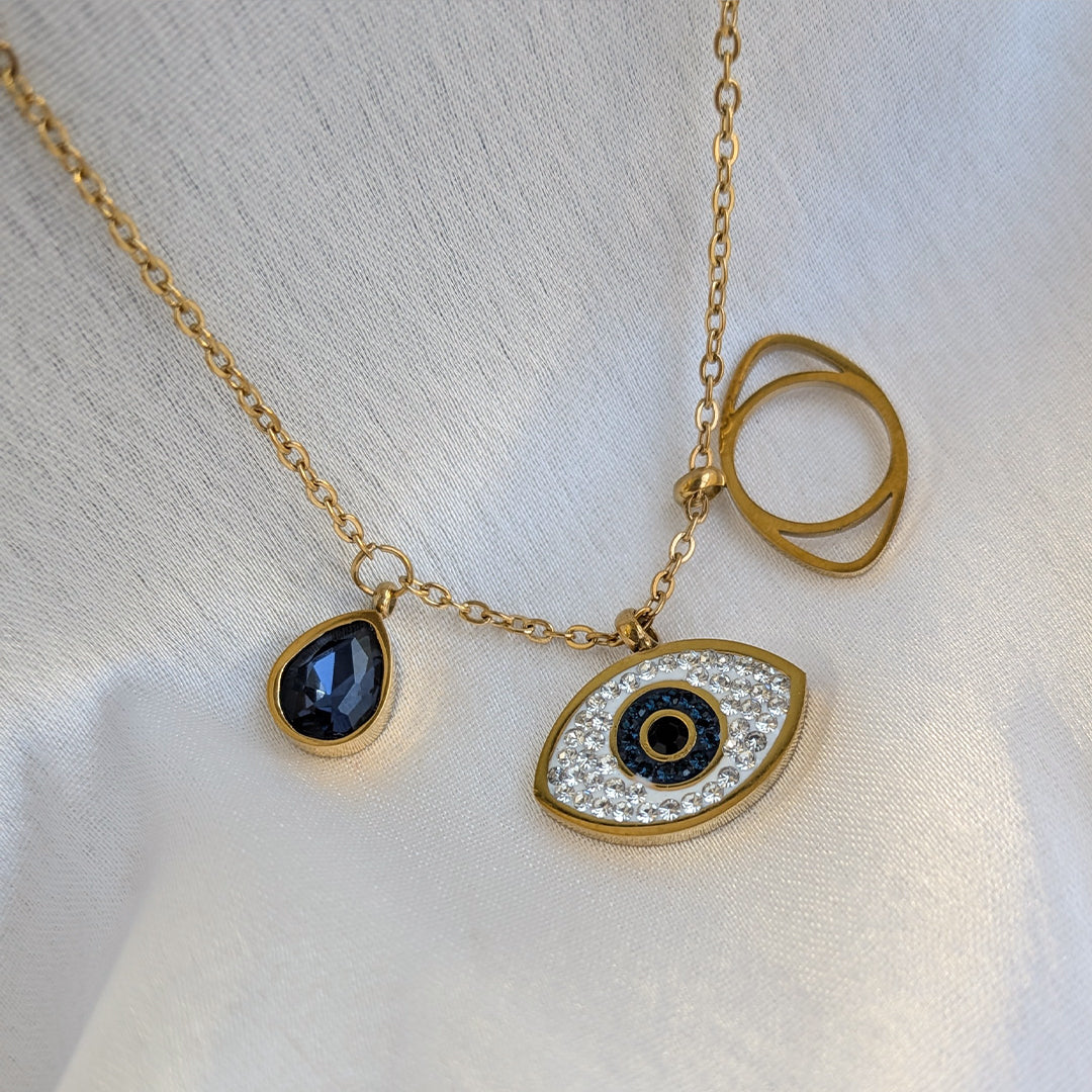 Bring style and positivity together with this beautifully designed Gold Plated Zirconia Studded Evil Eye Protection Pendant with Teardrop Accent For Girls & Women featuring a delicate teardrop accent. Crafted for girls and women who appreciate meaningful jewellery, this pendant symbolizes protection, good energy, and elegance—all in one stunning piece.