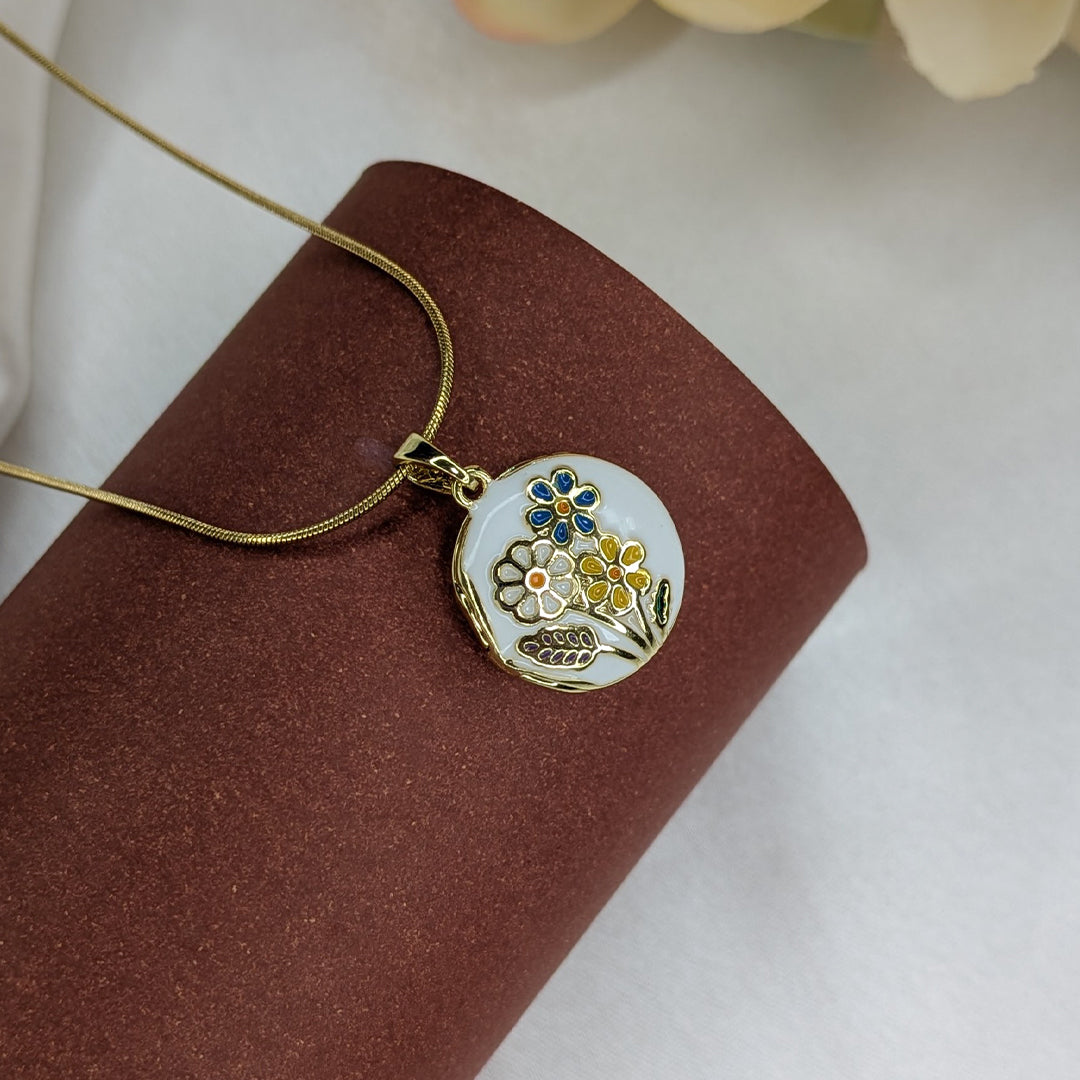Add charm and elegance to your look with this beautifully crafted floral openable locket pendant. Designed with intricate multi-flower enamel detailing, this pendant brings a vibrant, stylish touch to any outfit, Paired with a sleek, lightweight chain, this pendant is perfect for daily wear, casual outings, or special occasions. Its refined finish and colorful floral design make it an ideal choice for women and girls who love unique, eye-catching accessories. It also makes a wonderful birthday gift, party gift, or a thoughtful surprise for someone special.