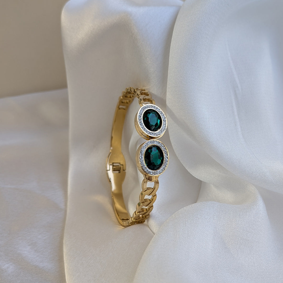 Add a touch of luxury to your style with this elegant Gold Tone Oval Emerald Crystal Cuff Bracelet. Designed with two striking emerald-green oval crystals framed by sparkling AD stones, this bracelet beautifully blends classic charm with modern sophistication. The smooth gold-tone finish and refined side link detailing make it a standout accessory for both everyday wear and special occasions. Lightweight, stylish, and eye-catching—this piece is ideal for girls and women who love timeless statement jewellery.