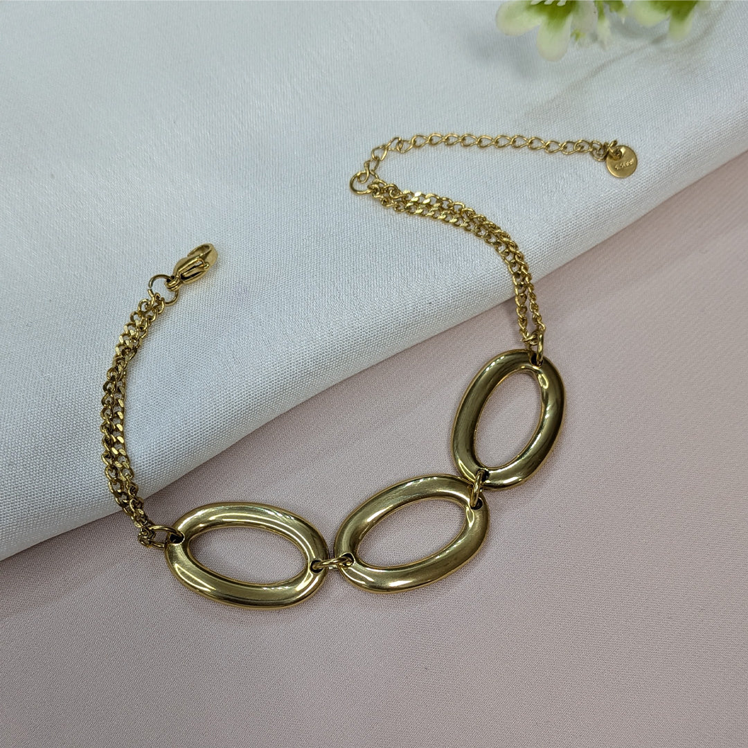 Embrace modern elegance with the Gold Finish Geometric Oval Link Bracelet for Women (Anti-Tarnish). Designed with sleek, interlocking oval links, this bracelet delivers a refined geometric aesthetic that is both stylish and timeless. The rich gold finish enhances every outfit with a premium glow, while the anti-tarnish coating ensures lasting shine and durability, even with regular wear. Lightweight yet statement-worthy, it sits comfortably on the wrist and pairs beautifully with layered accessories or worn solo for a chic minimalist look.