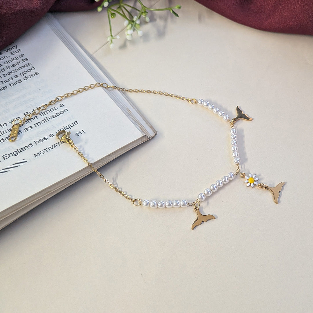 Gold Finish Dolphin Tail & Daisy Charm Pearl Anklet For Girls & Women