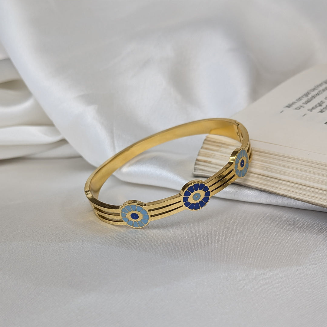 Protect your style and spirit with this stunning Evil Eye Bracelet, designed to blend ancient symbolism with modern fashion. Crafted from durable stainless steel and finished with a premium 18K gold-plated coating, this bracelet offers long-lasting shine, resistance to tarnish, and everyday comfort, The centerpiece Evil Eye motif is believed to bring protection, good luck, and positive energy, making this bracelet not only a stylish accessory but also a meaningful addition to your jewelry collection. Its sleek kada-style design ensures a secure fit while adding a bold and elegant touch to any outfit—perfect for daily wear, parties, festivals, or gifting.