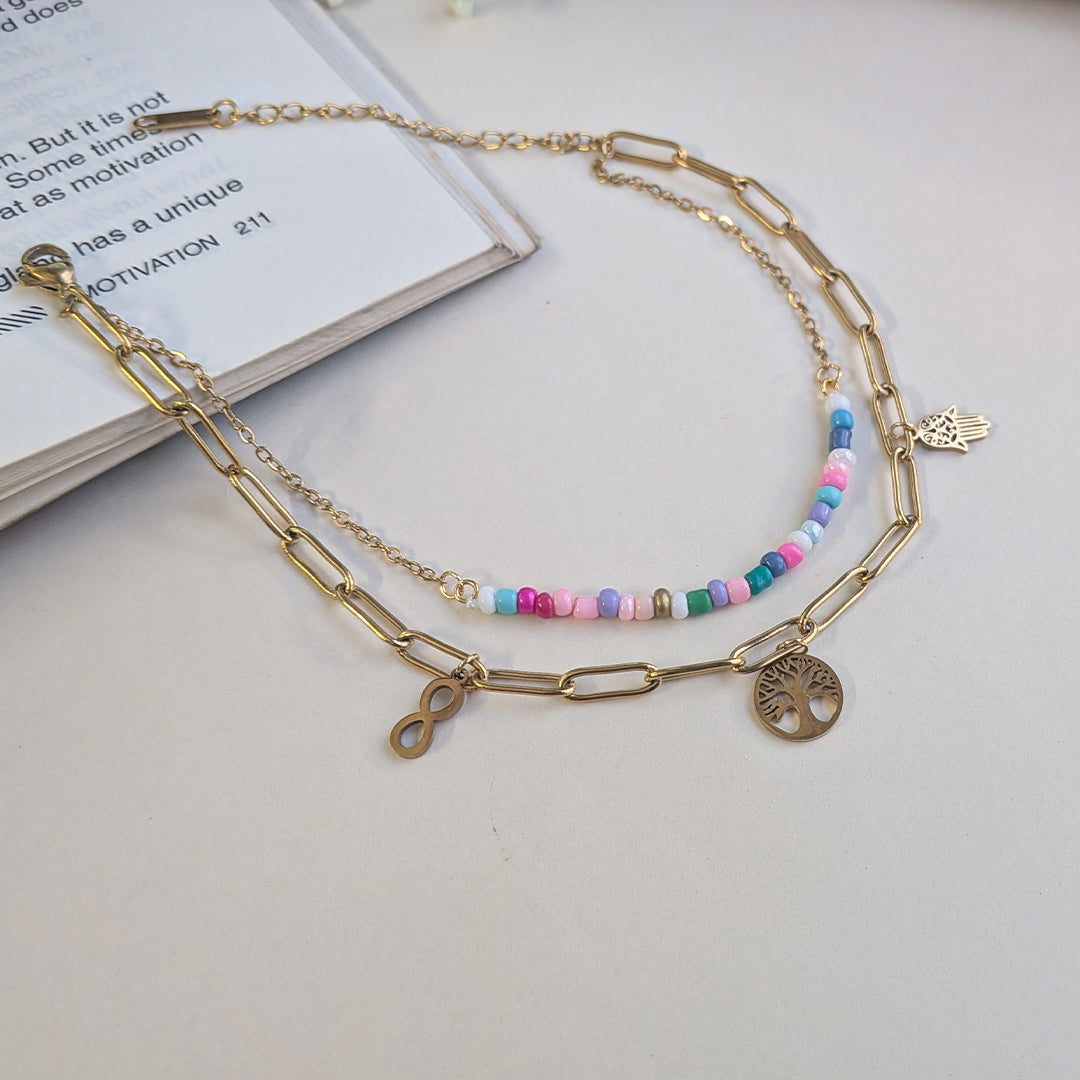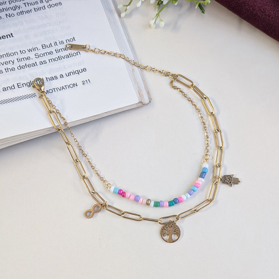 Add a pop of color and positivity to your look with this Gold Tone Multicolor Beaded Charm Anklet for Women & Girls, This stylish anklet features a trendy dual-chain design one layer adorned with vibrant multicolor beads and another embellished with symbolic gold charms including the Tree of Life, Infinity, and Hamsa Hand. Crafted from high-quality alloy with a lustrous gold finish, it brings together boho chic and spiritual elegance in one beautiful accessory, Lightweight, durable, and adjustable for a comfortable fit, this anklet pairs effortlessly with casual, beachwear, or festive outfits. An ideal gift for birthdays, anniversaries, Valentine’s Day, Raksha Bandhan, or any special celebration.