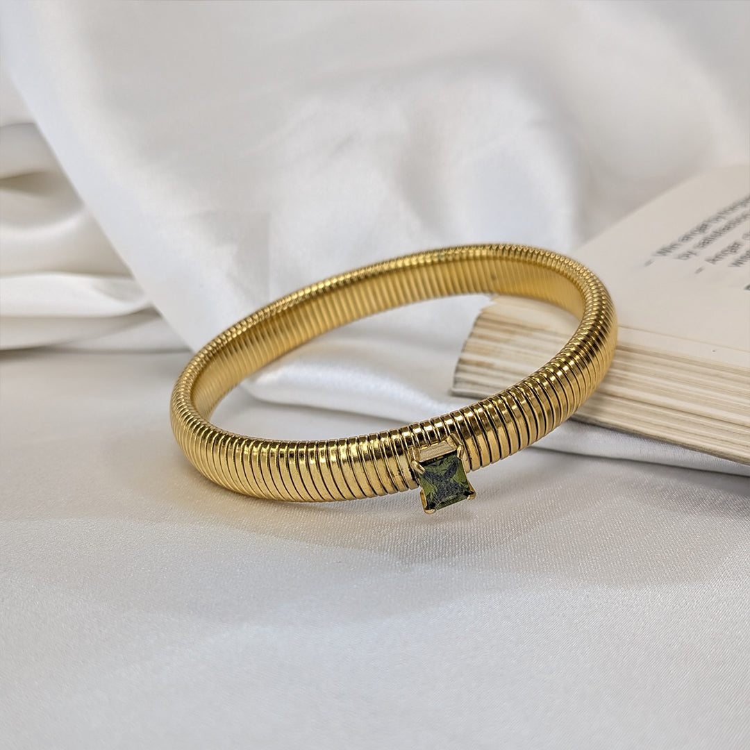 luxurious gold finish coil bracelet, Designed with a sculptural wrap-around structure, it features a stunning stone accent that adds a bold touch of sophistication. The flexible, adjustable coil ensures a comfortable fit for all-day wear, making it both stylish and practical, A striking statement piece, this bangle effortlessly enhances any outfit—whether you're dressing up for a special event, a birthday party, or adding a chic accent to your everyday style. It also makes a thoughtful gift option for birthdays, anniversaries, and other special celebrations.