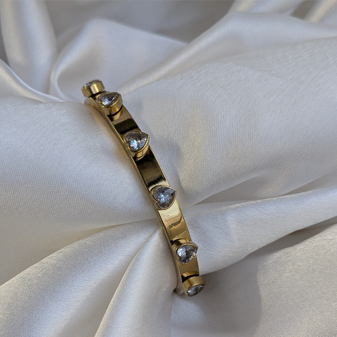 Add a touch of charm and elegance to your look with this Gold Finish Heart Stone Bracelet, designed to bring playful sophistication to your style. Featuring beautifully crafted heart shaped stones, this bracelet symbolizes love, joy, and grace, Made from premium stainless steel with a luxurious gold-plated finish, it’s anti-tarnish, durable, and comfortable for everyday wear. The sleek bangle design with a secure closure ensures a perfect fit, making it a versatile piece for both casual and festive occasions, Perfect for parties, festive celebrations, date nights, and special gatherings, and a delightful and elegant gift for birthdays, anniversaries, Valentine’s Day, or to surprise someone special with a timeless piece of jewelry.