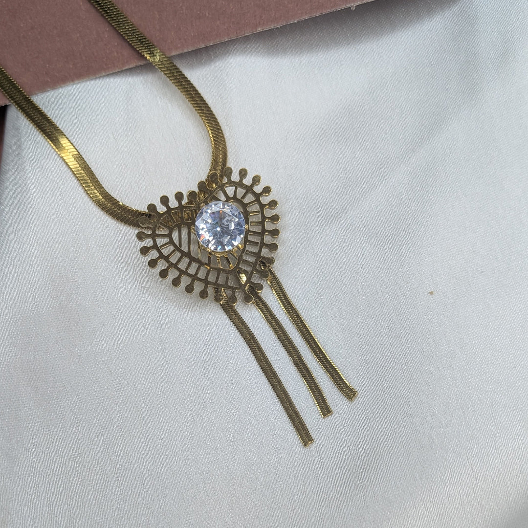 Elevate your look with this Gold Plated Filigree Heart Crystal Jewelry Set, designed to capture timeless elegance and modern sophistication. The set features a beautifully detailed heart-shaped pendant and matching earrings, adorned with a radiant cubic zirconia stone at the center. The intricate filigree design and delicate gold tassels create a graceful flow, making it perfect for festive occasions, parties, or elegant evening wear.