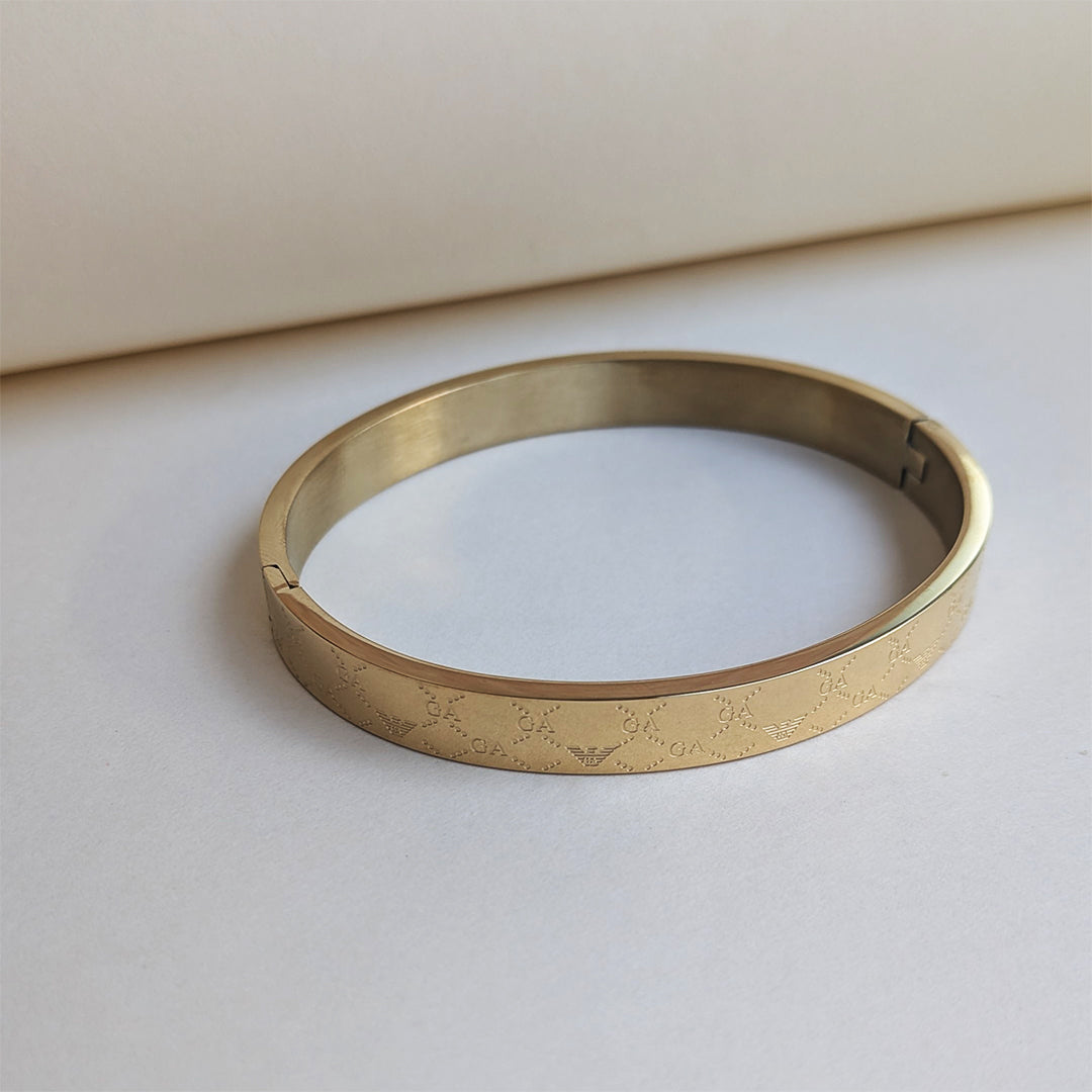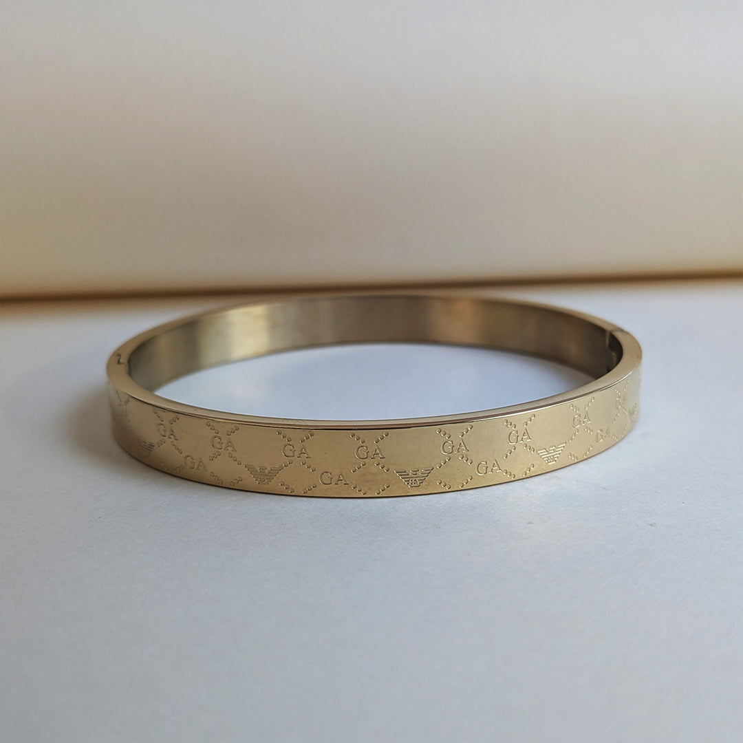 Make a bold yet refined statement with this Gold Plated Luxury Armani Brand Inspired Monogram Engraved Designer Stainless Steel Bracelet for Men, crafted to embody timeless sophistication. The bracelet showcases a detailed monogram engraving pattern across a sleek, high-polish gold surface, symbolizing elegance and prestige.