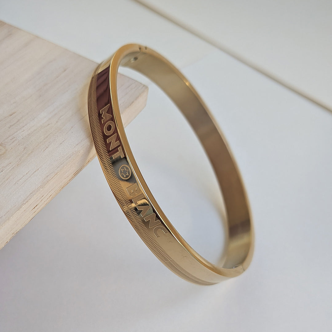 "This Gold Plated Montblanc Brand Inspired Designer Luxury Stainless Steel Bracelet for Men is the perfect fusion of elegance and modern craftsmanship. Featuring a refined Montblanc-inspired engraved logo and subtle edge detailing, it radiates sophistication, class, and prestige.