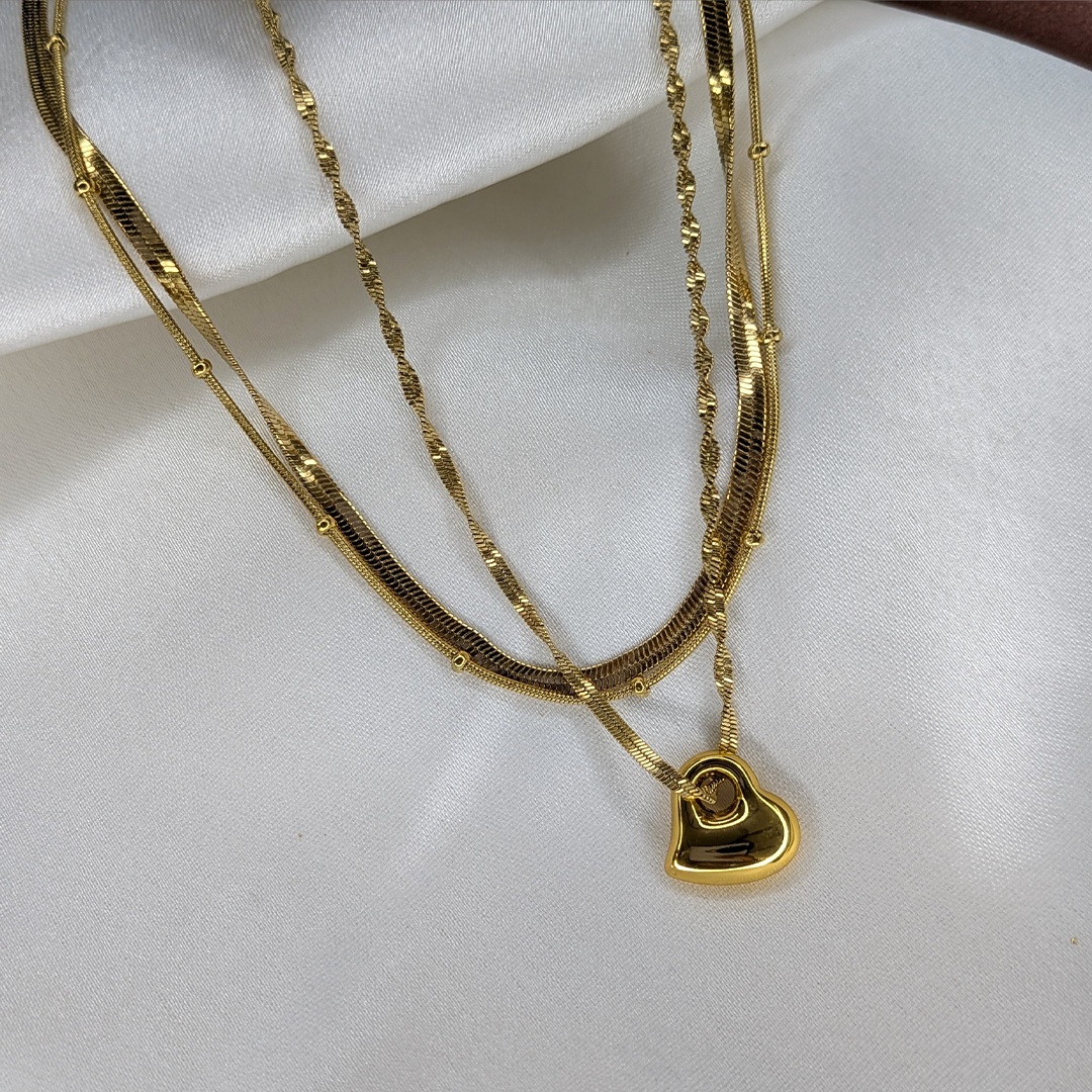 The set features a mix of three distinct chains for a trendy, stacked appearance: a sleek snake chain, a delicate beaded chain, and a twisted link chain. The centerpiece is an elegant, polished twisted heart pendant that adds a touch of romantic charm and modern design. This versatile accessory effortlessly enhances any outfit, from casual attire to more formal wear. It makes an ideal gift that combines resilience with delicate, eye-catching elegance, perfect for daily use or special occasions.