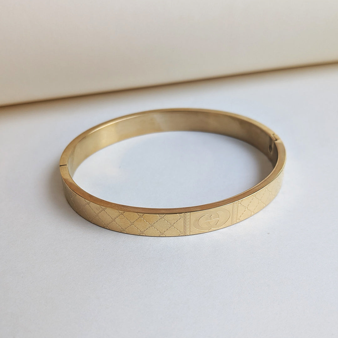 "This Luxury Gucci Brand Inspired Designer Geometric Engraved Stainless Steel Bracelet for Men is a stunning blend of sophistication, craftsmanship, and modern design. The intricate geometric engraving reflects premium artistry, while the mirror-polished gold plating exudes elegance and luxury reminiscent of iconic Gucci-inspired style.