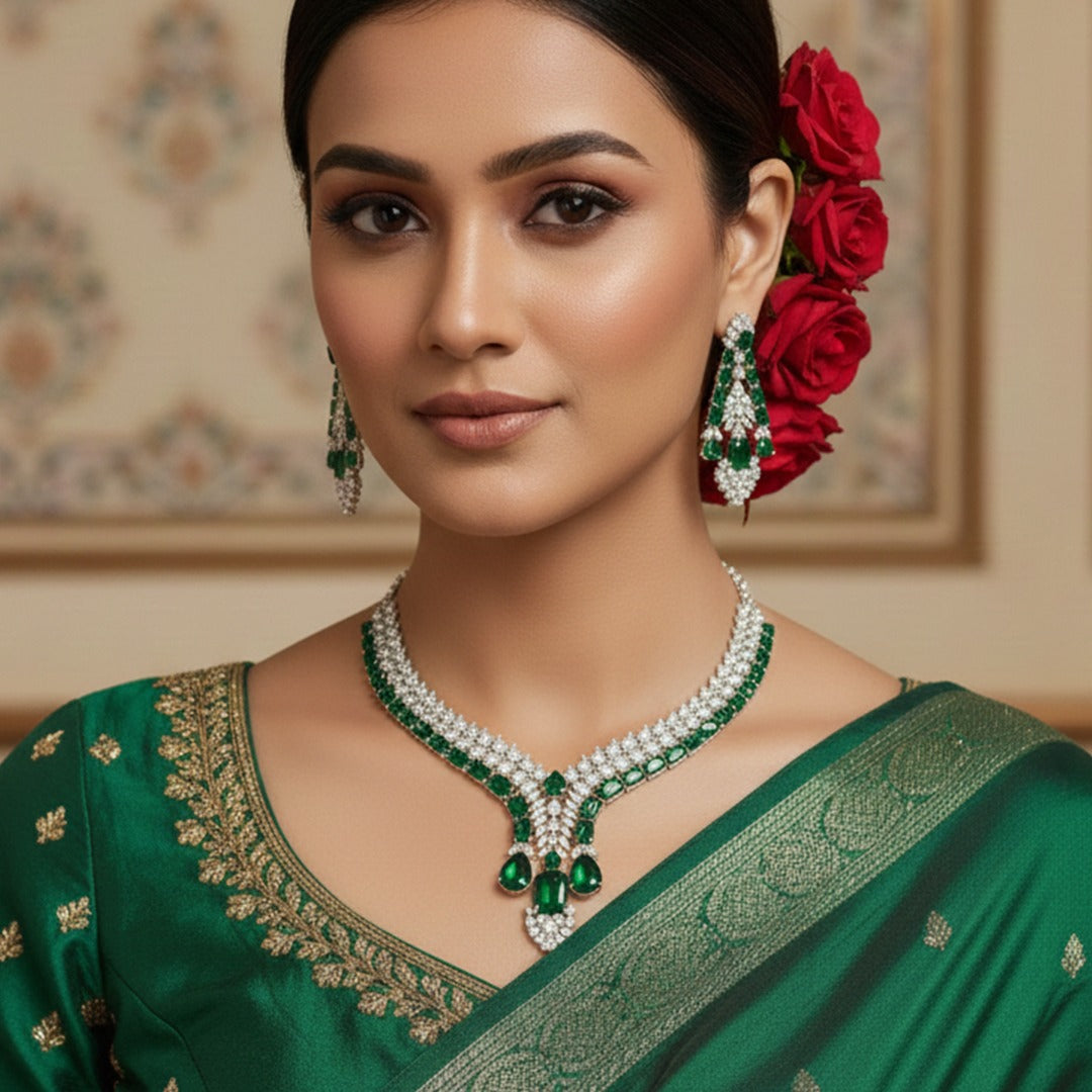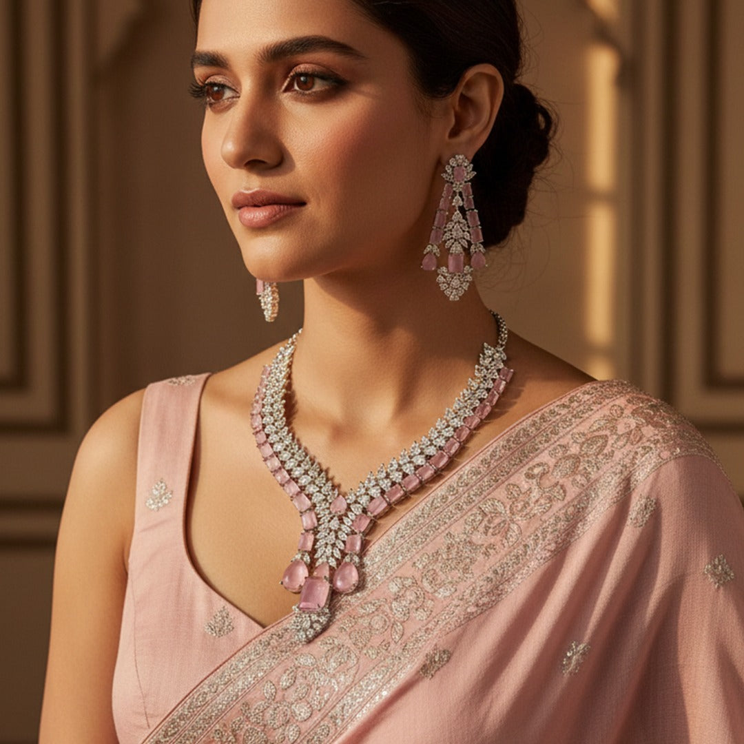 Paired with coordinating drop earrings, this jewellery set adds a touch of sophistication and glamour to festive looks, weddings, evening parties, and special celebrations. The intricate stone detailing reflects light beautifully, ensuring a standout presence while maintaining a graceful, polished appeal.