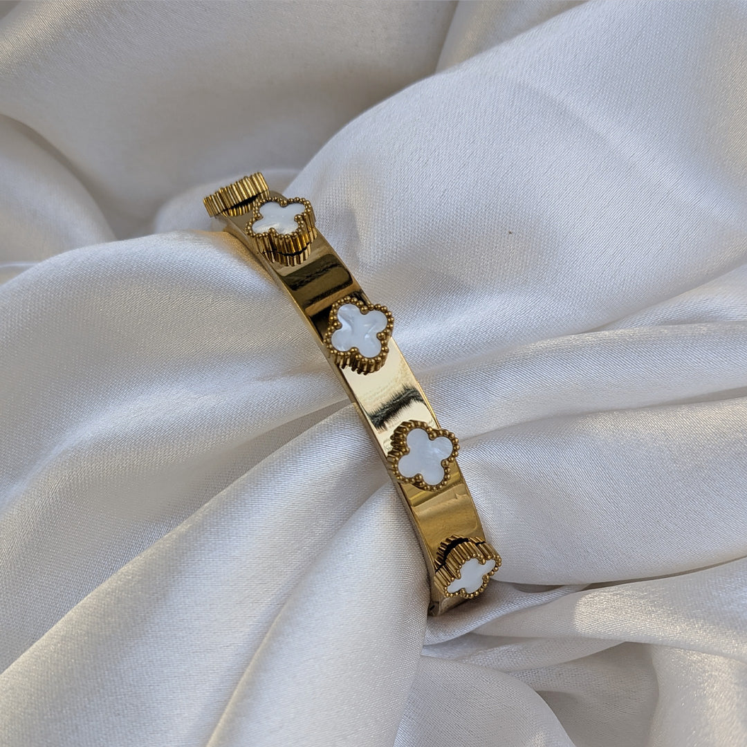 Add a touch of timeless elegance to your everyday style with this Gold Plated White Clover Charm Bracelet, designed to bring sophistication and charm to any look. Featuring beautifully crafted white clover motifs set on a sleek gold-plated band, this bracelet blends minimalism with luxury.